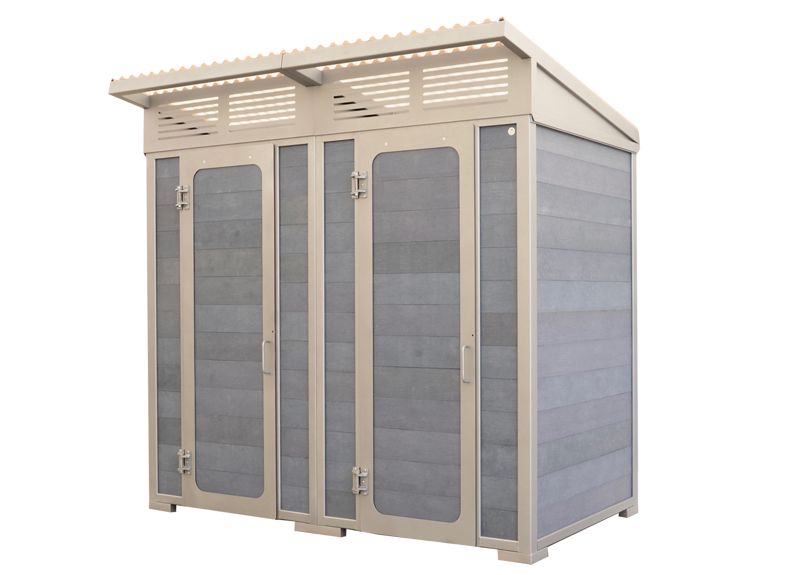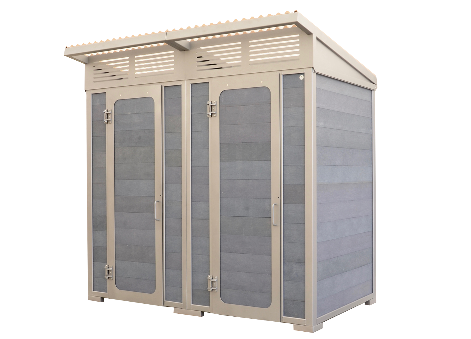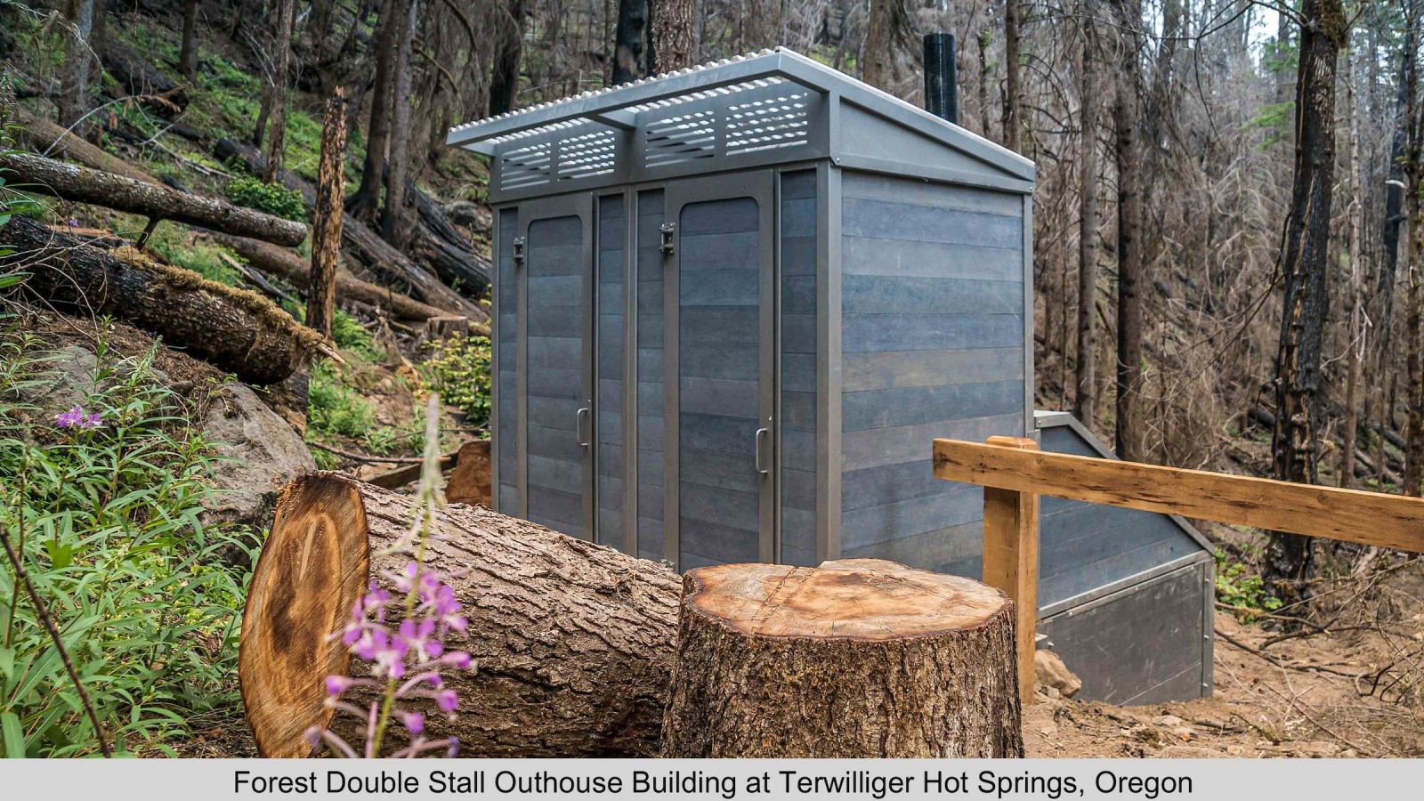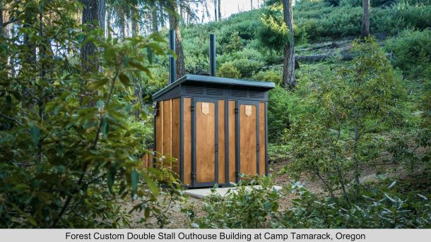 The Forest Double Stall Outhouse was designed at the request of one of our customers asking for a building that could potentially have multiple washrooms all under one roof system, as the John series roof design could not allow for this. We created a slanted roof design so there could be as many toilets in a row as the space allows. To date, we have built as many as four in a row. Similar to the John series the Forest Regular Double Stall addresses many of the issues typically associated with outdoor latrine buildings in semi-remote locations. These include transportation and handling, assembly, and the use of materials that require minimal maintenance over several years in a wide range of diverse environments. The Forest meets and exceeds these expectations. Strategically designed as a modular system, the individual components can be easily carried into semi-remote locations and be put together with minimal tools at a fraction of the traditional wood and concrete alternatives. The building is made from sturdy lightweight powder coated aluminum components, making it resistant to corrosion. The tongue-in-groove recycled plastic lumber slats will not rot or absorb moisture and can be sprayed with bleach or disinfectant without damage. After cleaning, excess water simply drains out the sides from the raised walls. They fit seamlessly into channels with only a few hidden fasteners, also making the unit theft and tamper proof. Lack of lighting normally associated with these types of structures has also been addressed with a translucent one-piece roof. It provides plenty of light but it does not compromise its strength and acts as an effective barrier against sun, wind and rain. The one-piece roof structure caps the entire unit providing ample protection from the elements and locks the whole structure together making it extremely solid. expectations while providing a very comfortable and memorable user experience .