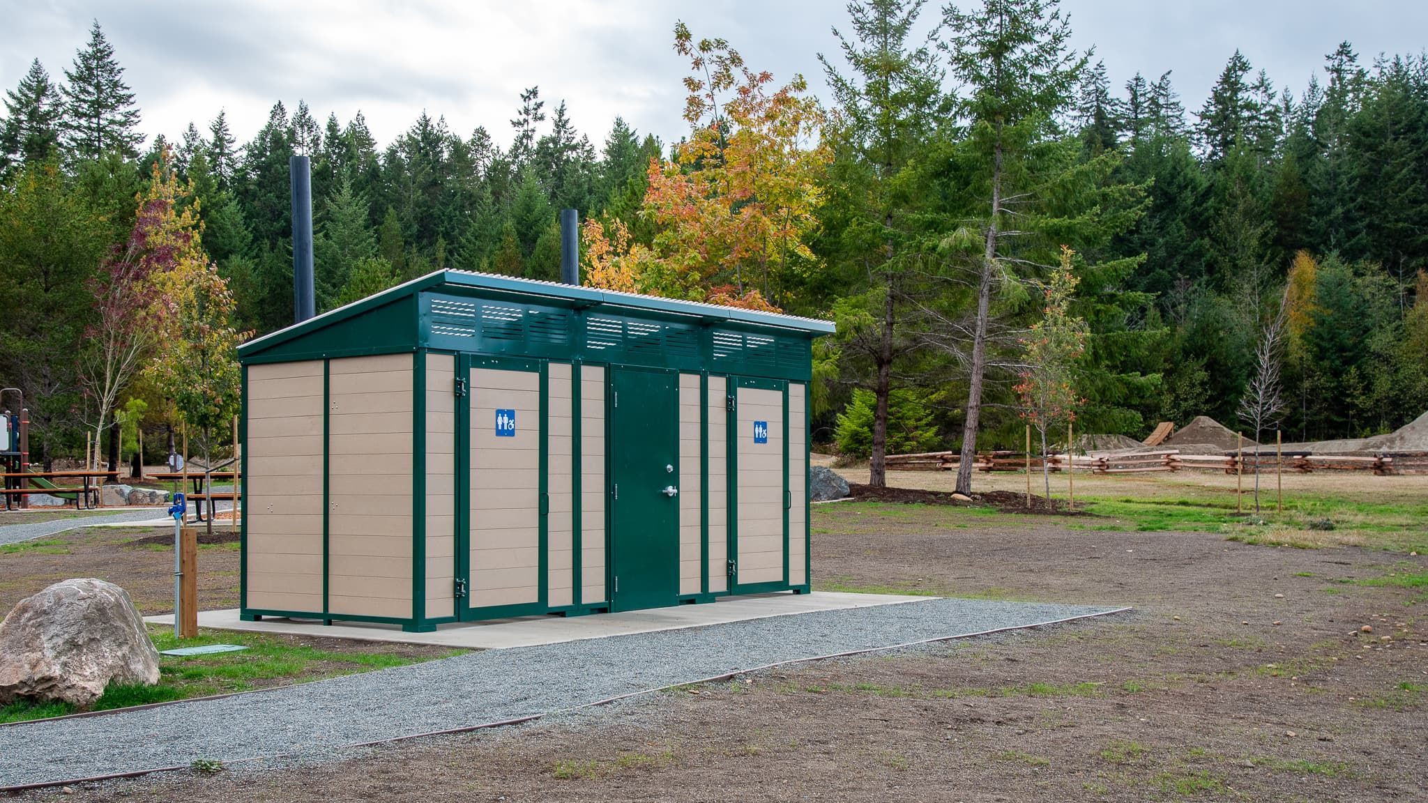 The Forest Outhouse was designed at the request of one of our customers asking for a building that could potentially have multiple washrooms all under one roof system as the John series roof design could not allow for this. We created a slanted roof design and now theoretically there could be as many toilets in a row as the space allows. To date we have done as many as 4 in a row. Similar to the “John” series the “Forest” addresses many of the issues typically associated with outdoor latrine buildings in semi-remote locations. These include transportation and handling, assembly, and the use of materials that require minimal if no maintenance over several years in a wide range of diverse environments. The “Forest” meets and exceeds these expectations while providing a very comfortable and memorable user experience .