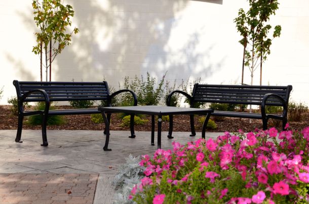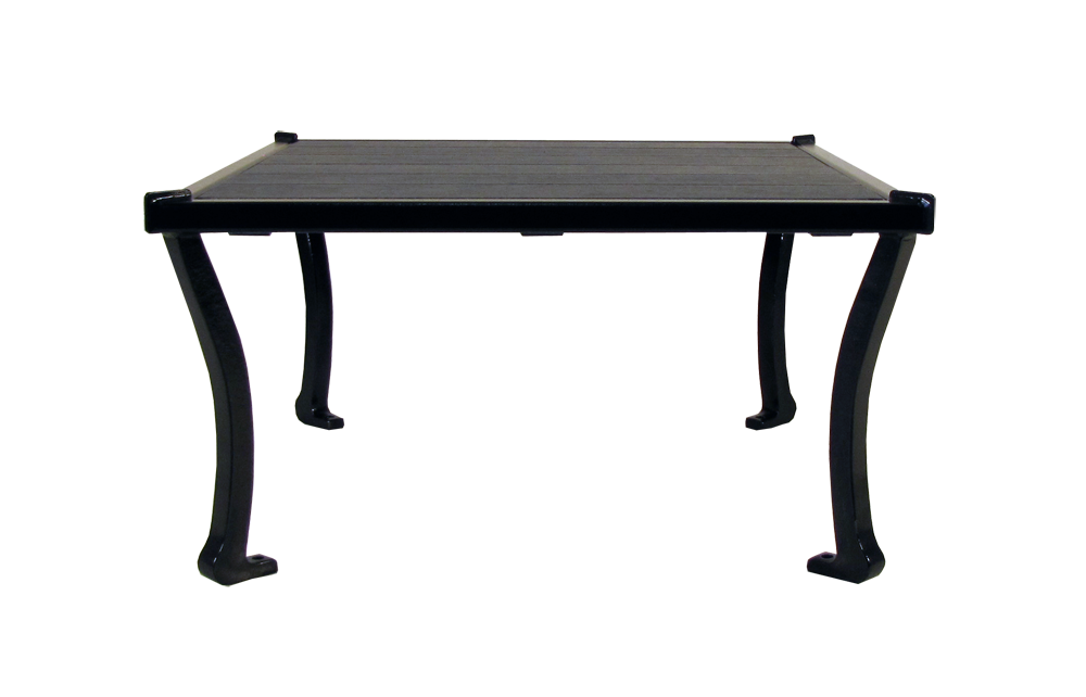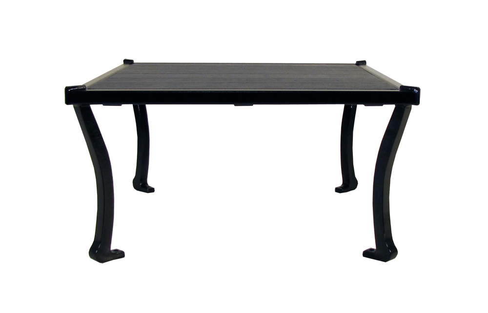 This rustic coffee table is designed to match our Mountain Classic Park Bench and create an indoor atmosphere in an outdoor application. The 100% recycled cast aluminum legs of the table are specifically made to match the profile of the leading edge of the bench design. Built-in corner features act as skate deterrents, while the all-plastic top is extremely sturdy and easy to clean. Easy to install, maintain, and fit replacement parts, this durable model is a great addition to a pair of benches or single seats.