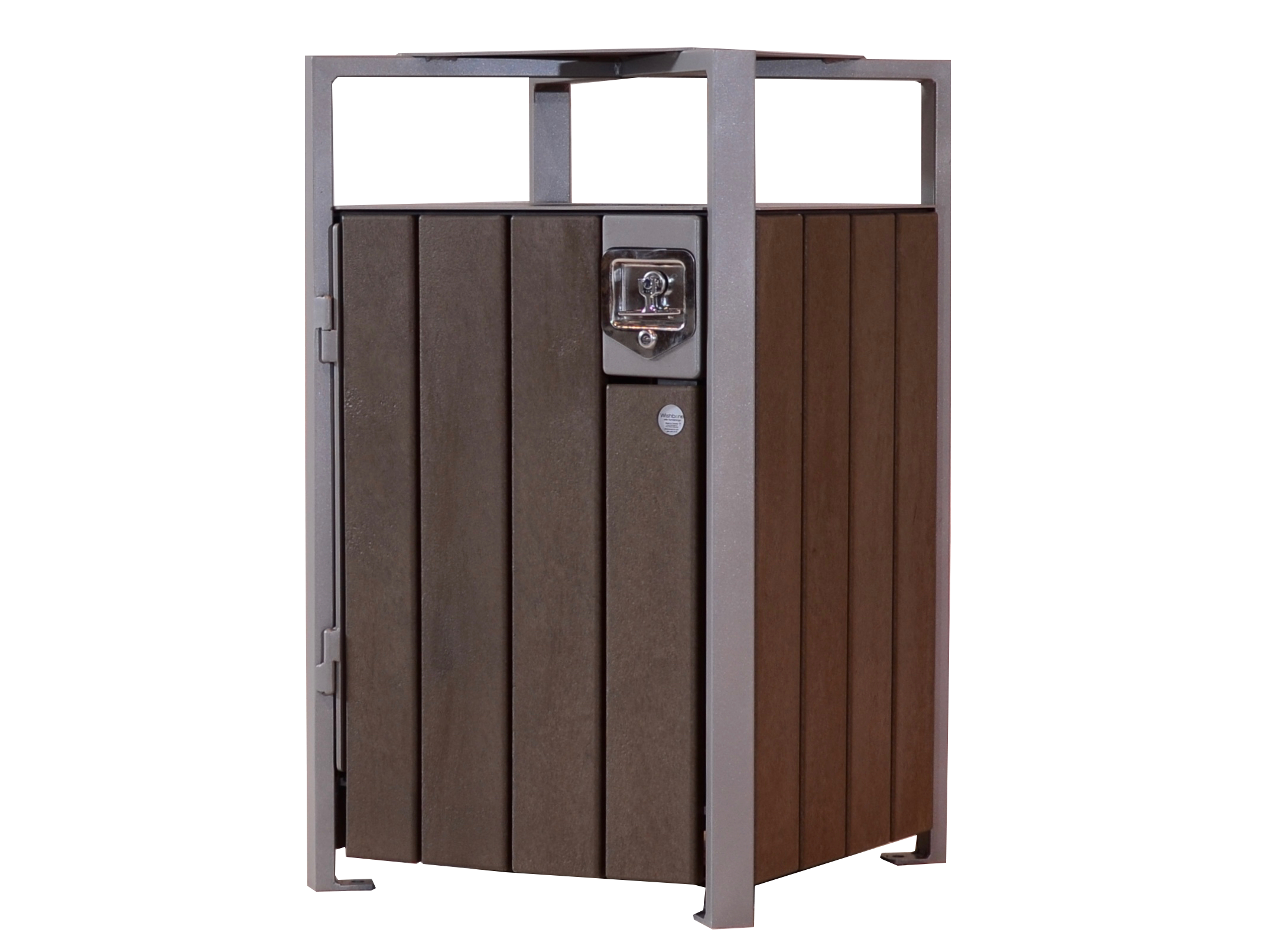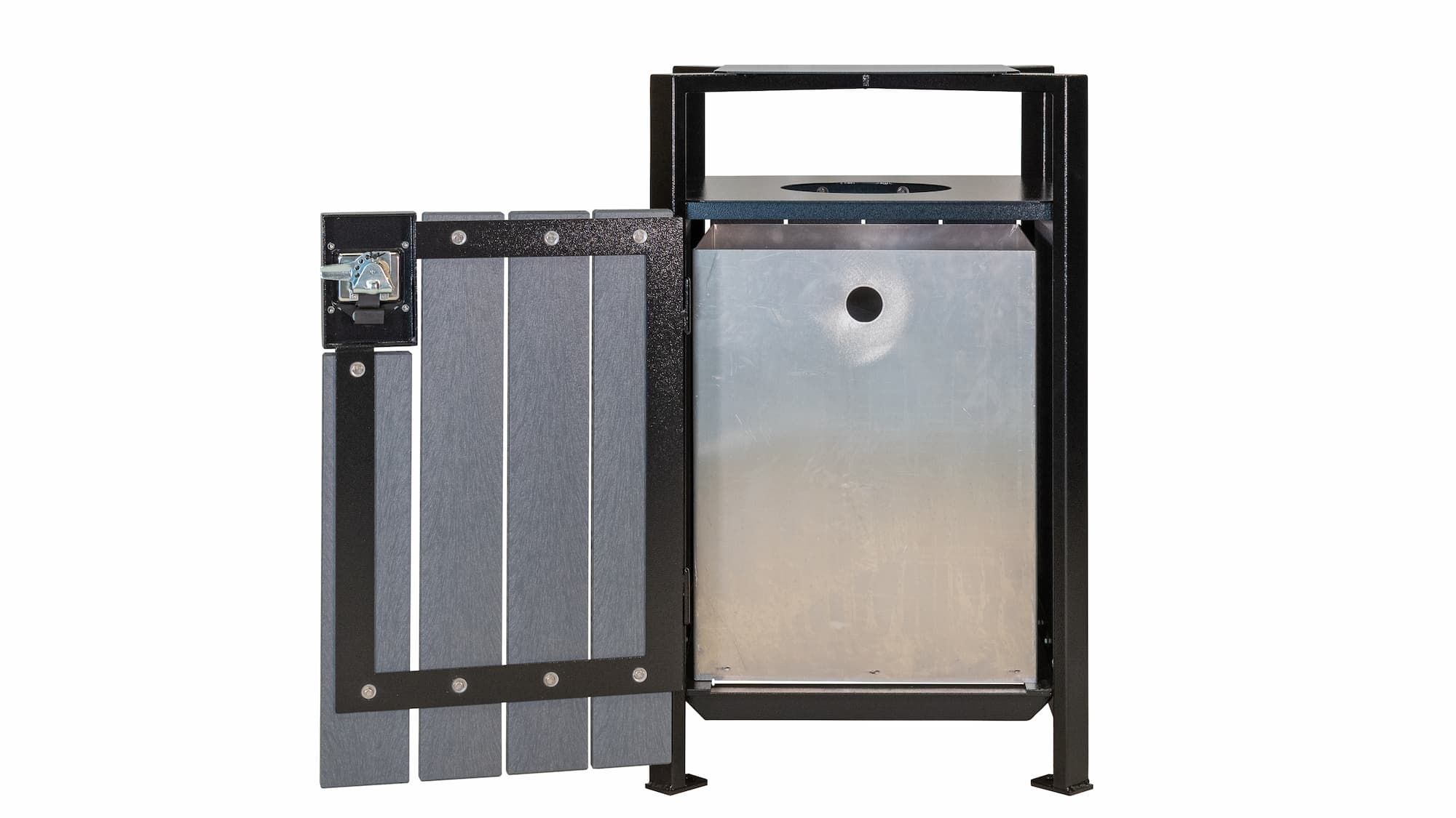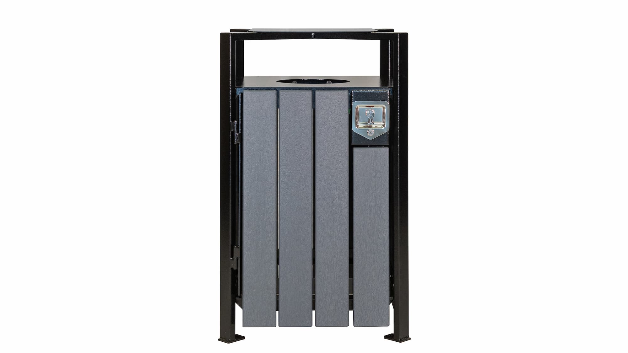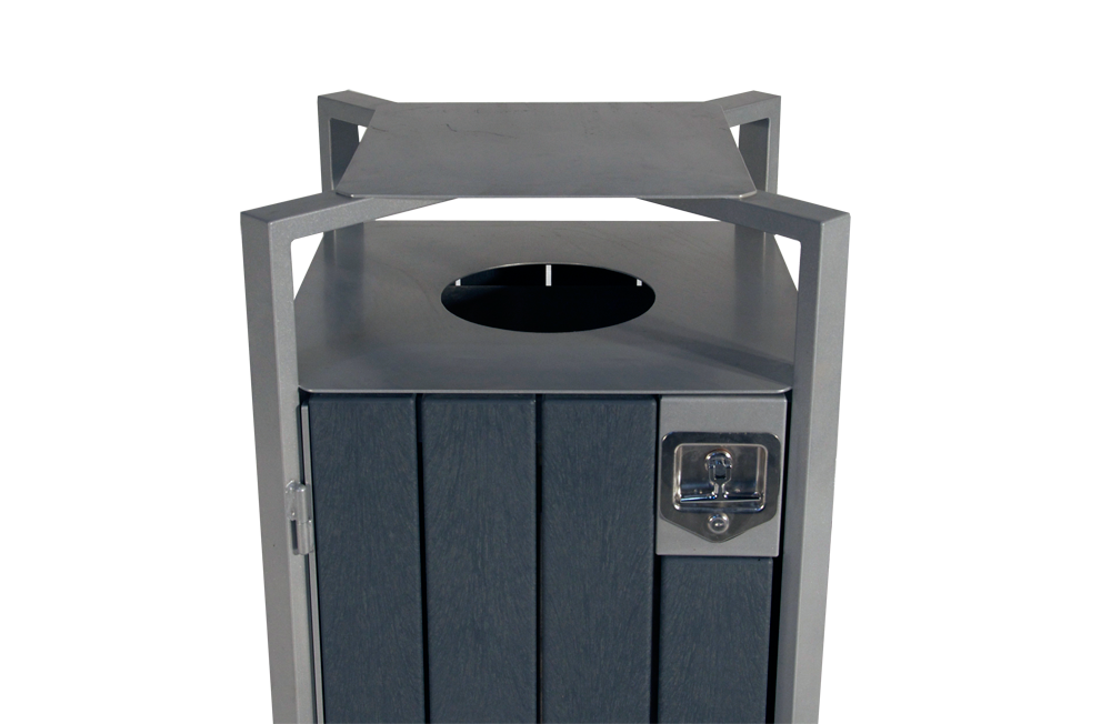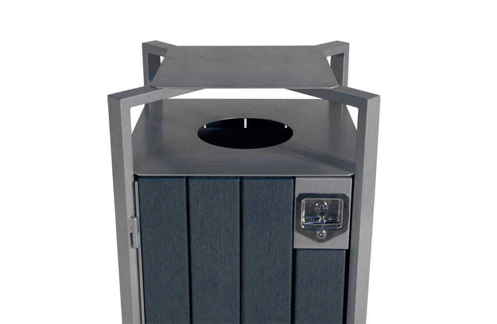 With clean lines and architectural sensibility on display, this unit was designed to match the Skyline Series of benches.  This solid top design allows access from all four sides, but still restricts the size and type of waste going into the unit. The water deflecting plate above the opening prevents water-filled garbage bags and makes it difficult for birds like crows or ravens to access. The built-in recessed handle lock and convenient side opening translate into easy cleaning and maintenance.  A great addition to any park or city sidewalk.