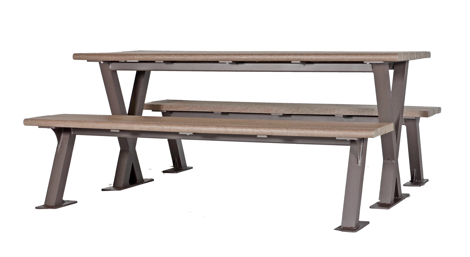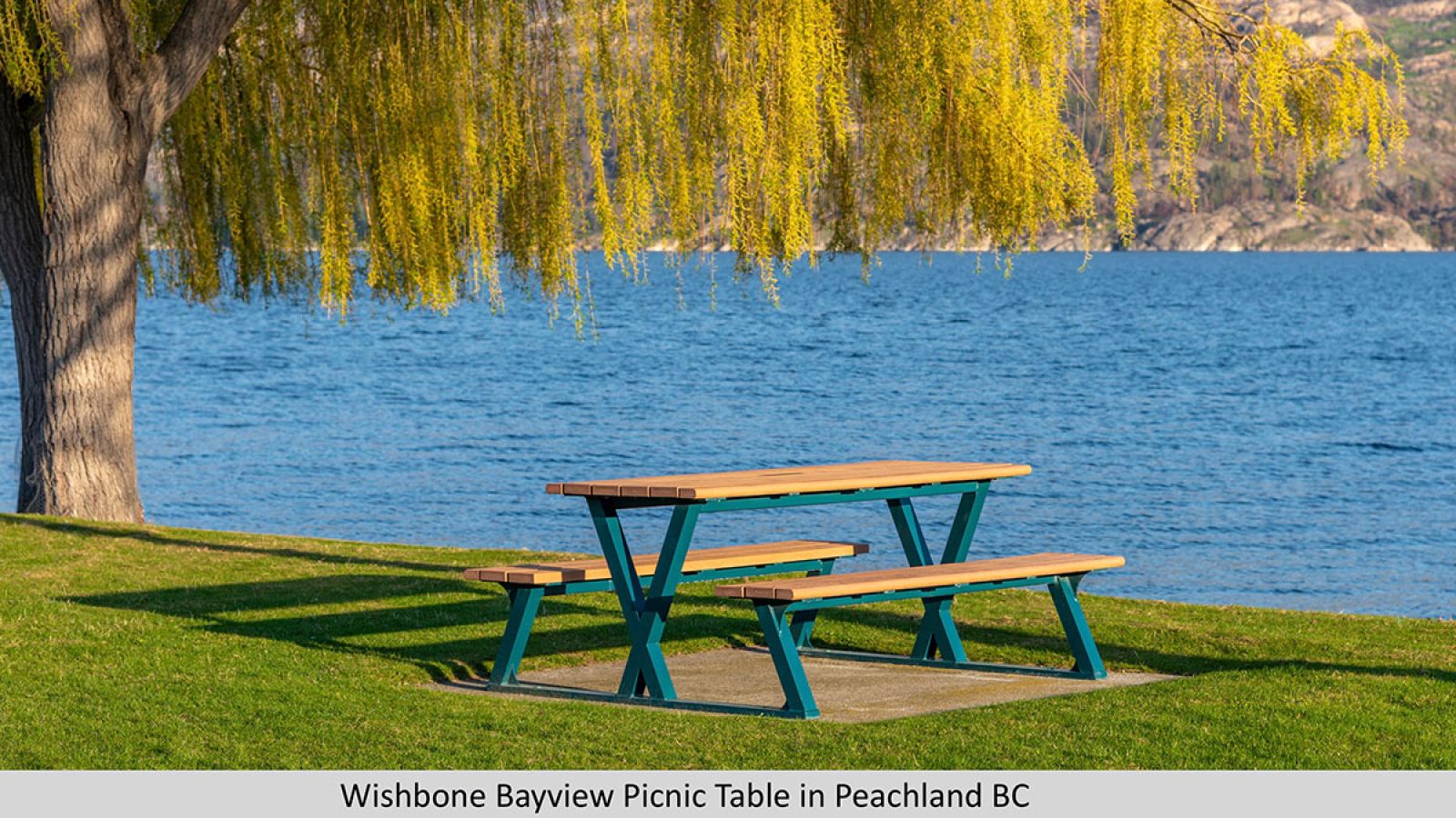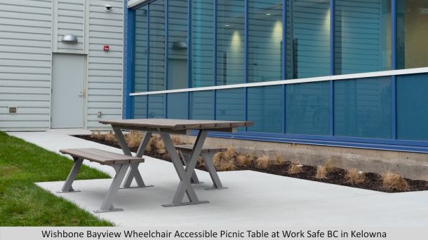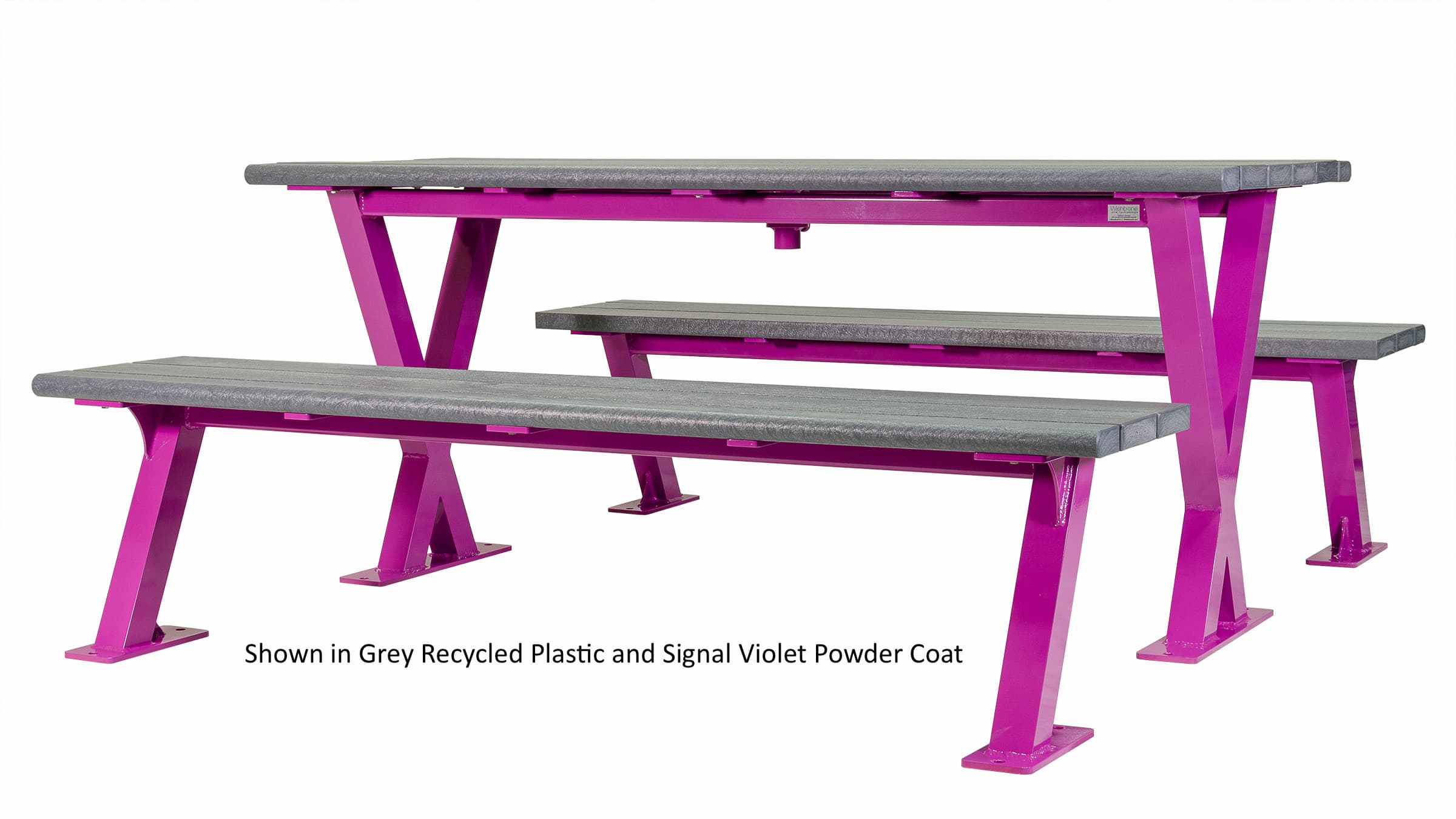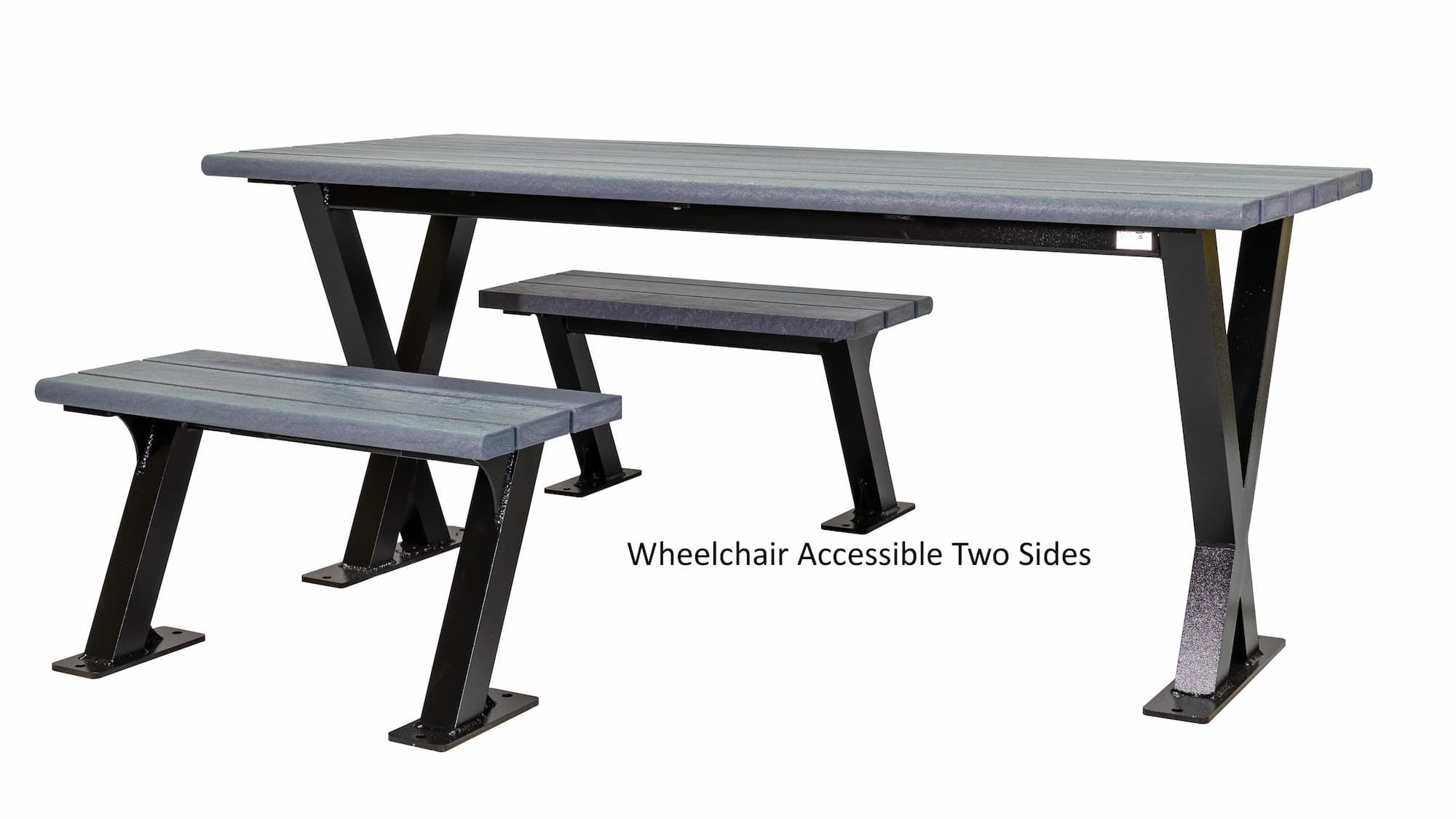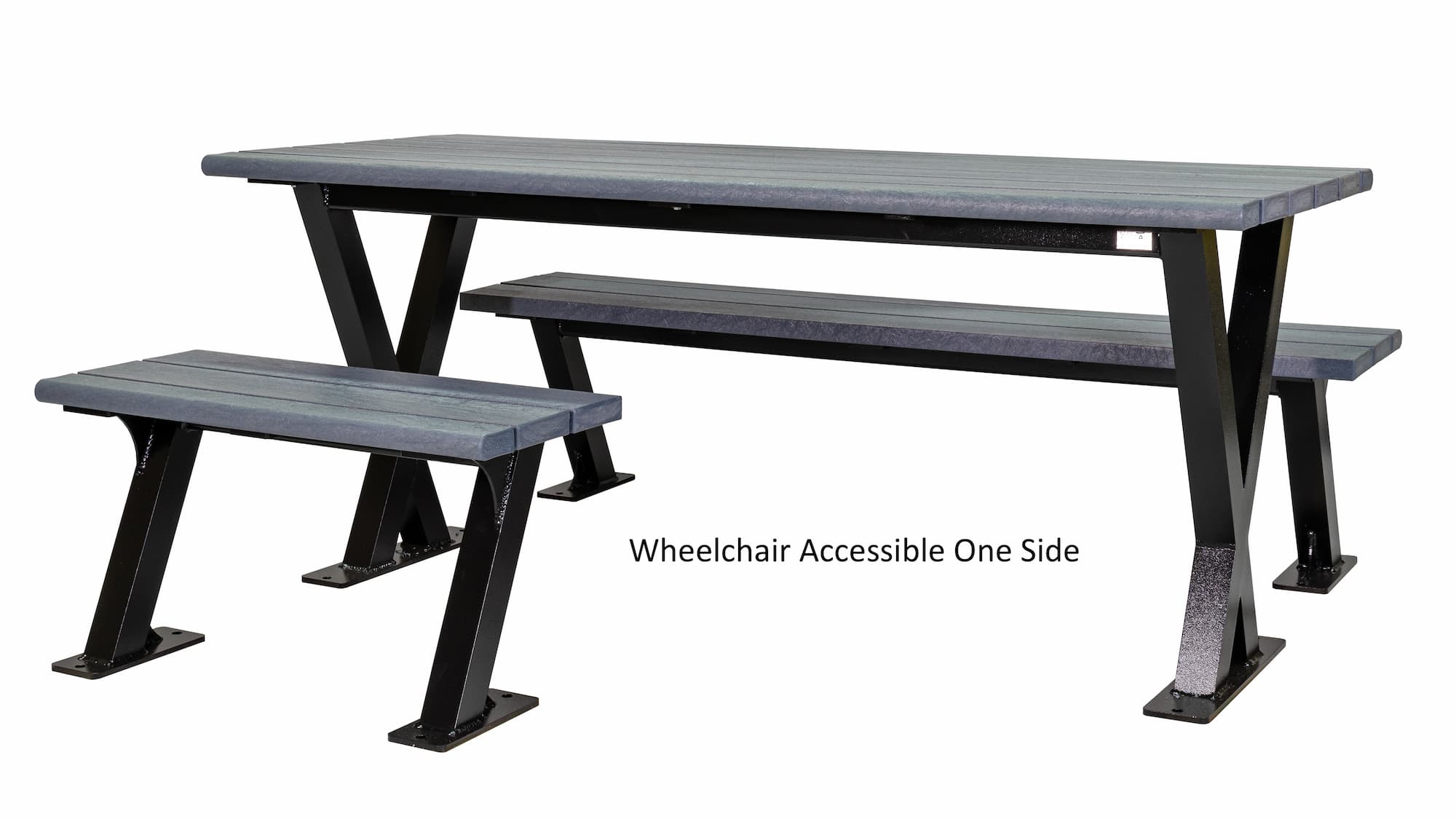 Aesthetically pleasing and extremely functional, the Bayview Picnic Table was designed to match our popular Bayview Park Bench. The goal with this model was to address the shortcomings of traditional picnic tables such as accessibility, comfort, and seat depth. To increase accessibility, the feet and structural elements are angled away from the user meaning less bumped knees and awkward entries. Bull-nosed boards on the tabletop and seat soften the edges and allow a person to comfortably lean against the table edge as a backrest. The Bayview Picnic Table also has a significantly wider seat depth to accommodate a variety of patrons.   It can be Wheelchair accessible with either a table top extension, or by custom building it as a one-sided picnic table with no bench on one side.  This design has all the low- maintenance features inherent to our products: powder coated aluminum frame, 100% recycled plastic slats, and stainless-steel fasteners.