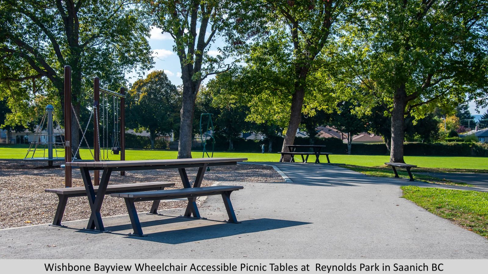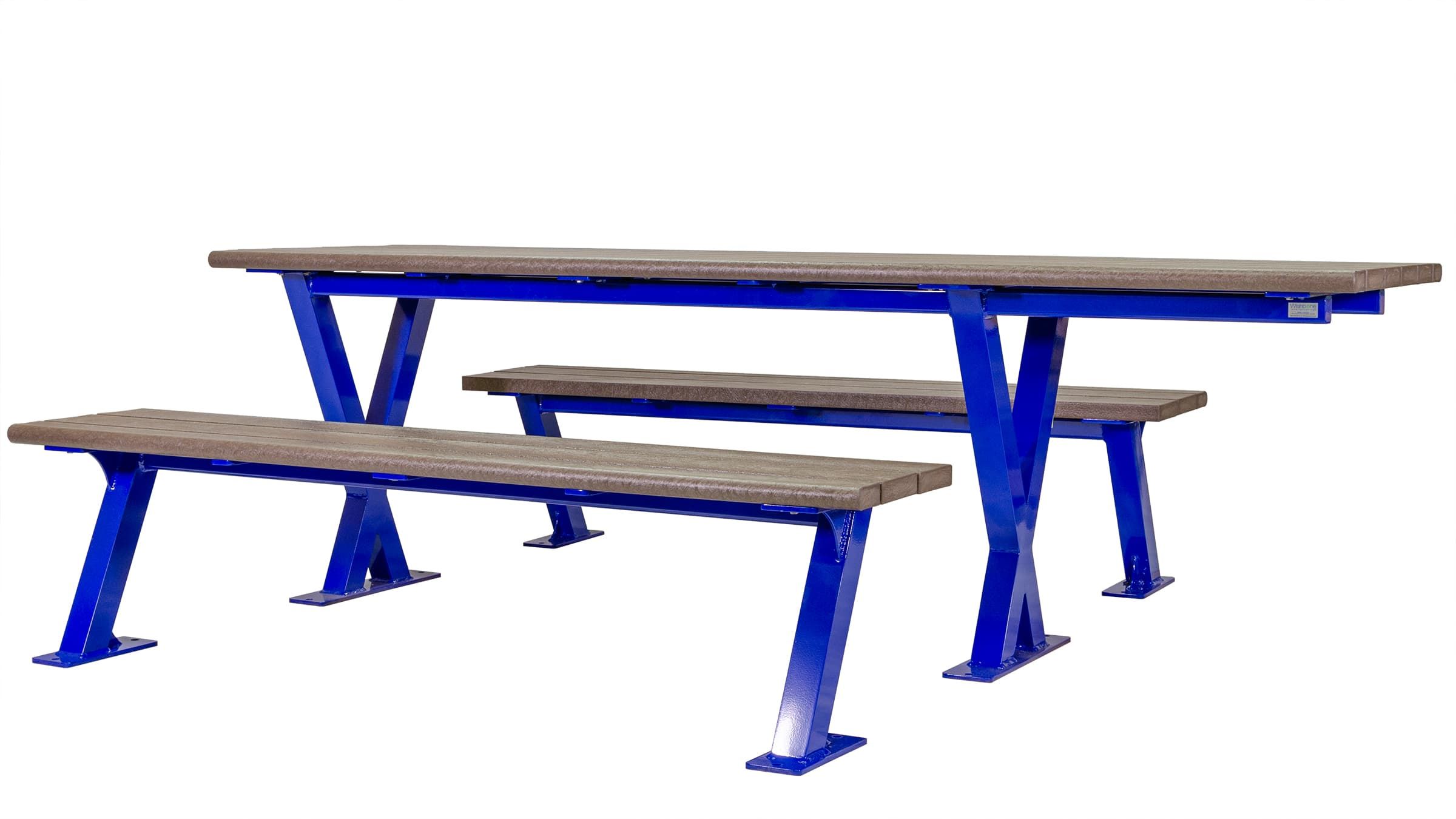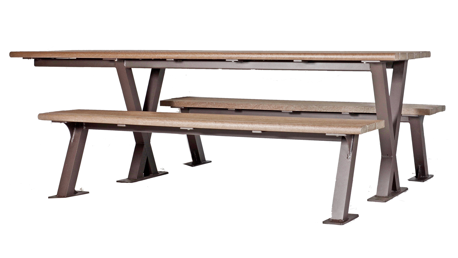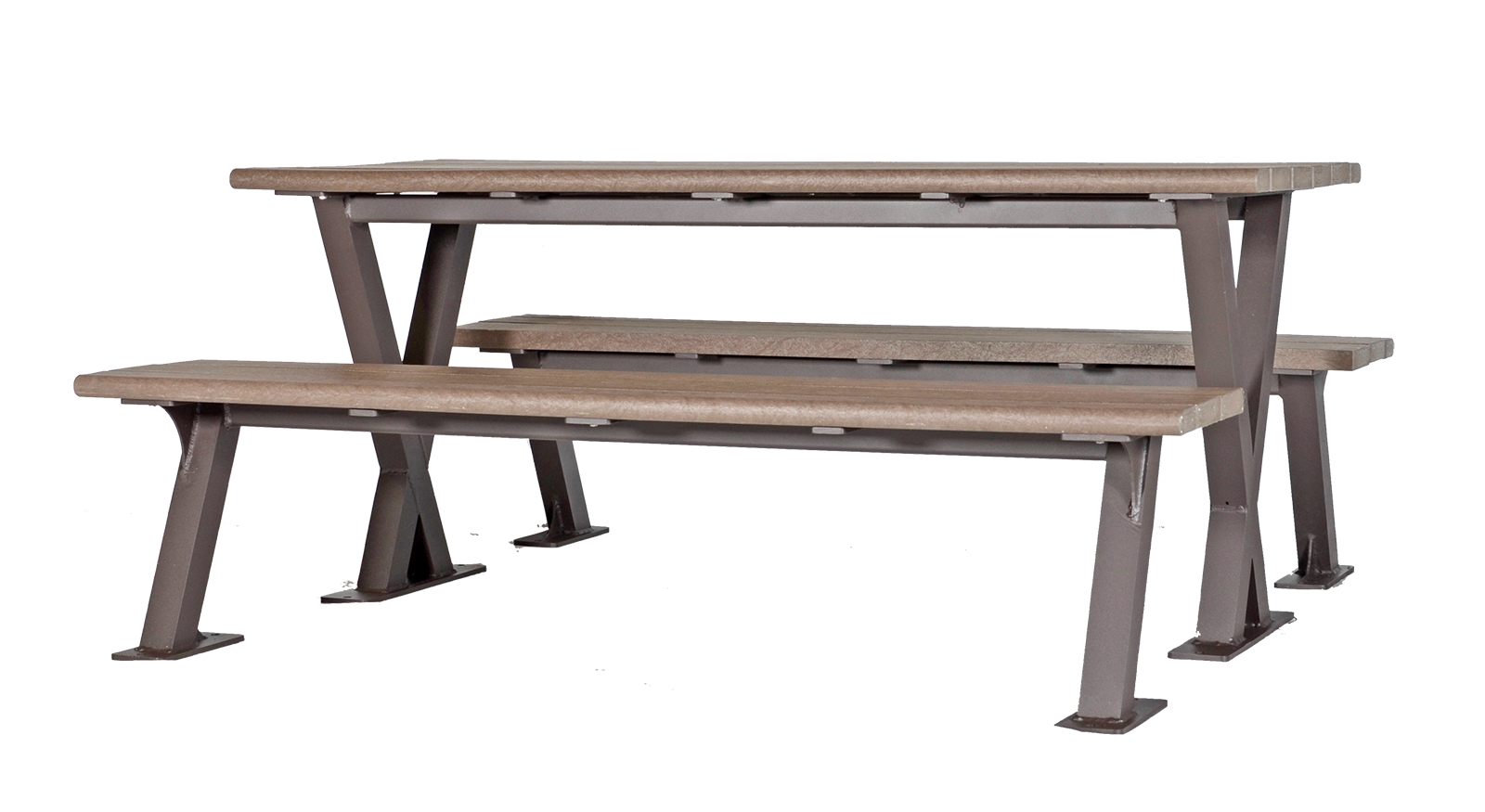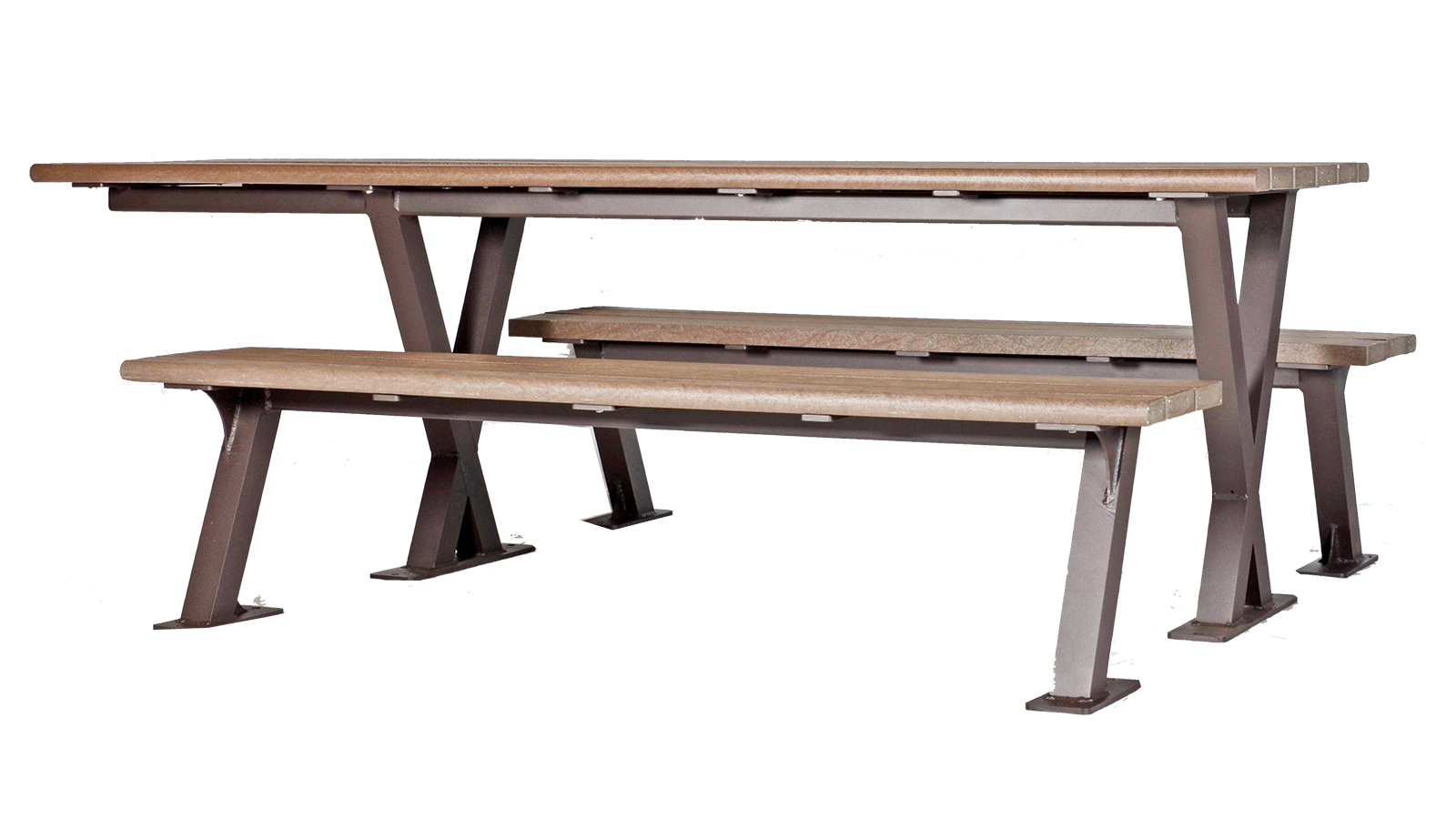 Aesthetically pleasing and extremely functional, the Bayview Picnic Table was designed to match our popular Bayview Park Bench. The goal with this model was to address the shortcomings of traditional picnic tables such as accessibility, comfort, and seat depth. To increase accessibility, the feet and structural elements are angled away from the user meaning less bumped knees and awkward entries. Bull-nosed boards on the tabletop and seat soften the edges and allow a person to comfortably lean against the table edge as a backrest. The Bayview Picnic Table also has a significantly wider seat depth to accommodate a variety of patrons.   It can be Wheelchair accessible with either a table top extension, or by custom building it as a one-sided picnic table with no bench on one side.  This design has all the low- maintenance features inherent to our products: powder coated aluminum frame, 100% recycled plastic slats, and stainless-steel fasteners.