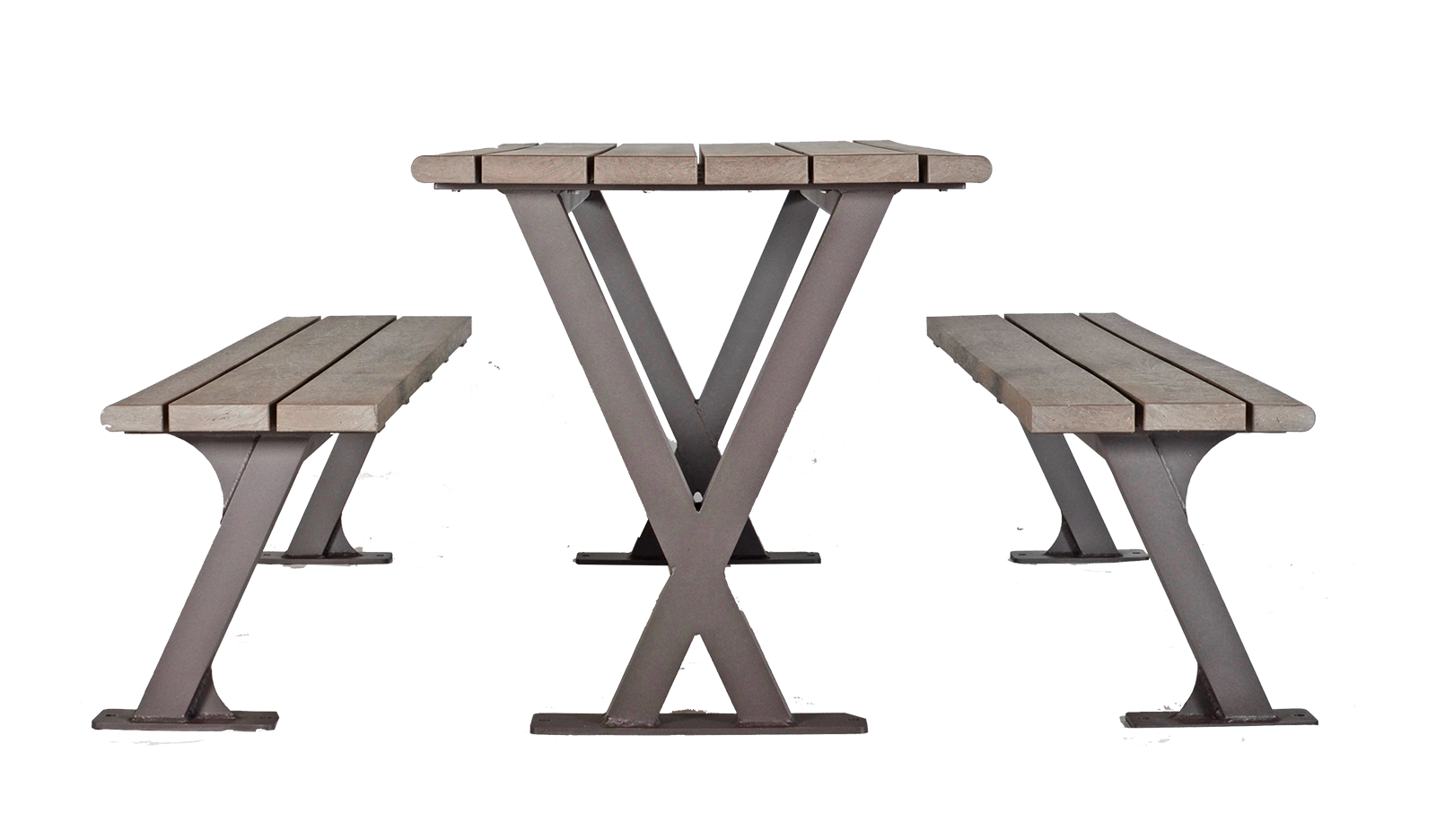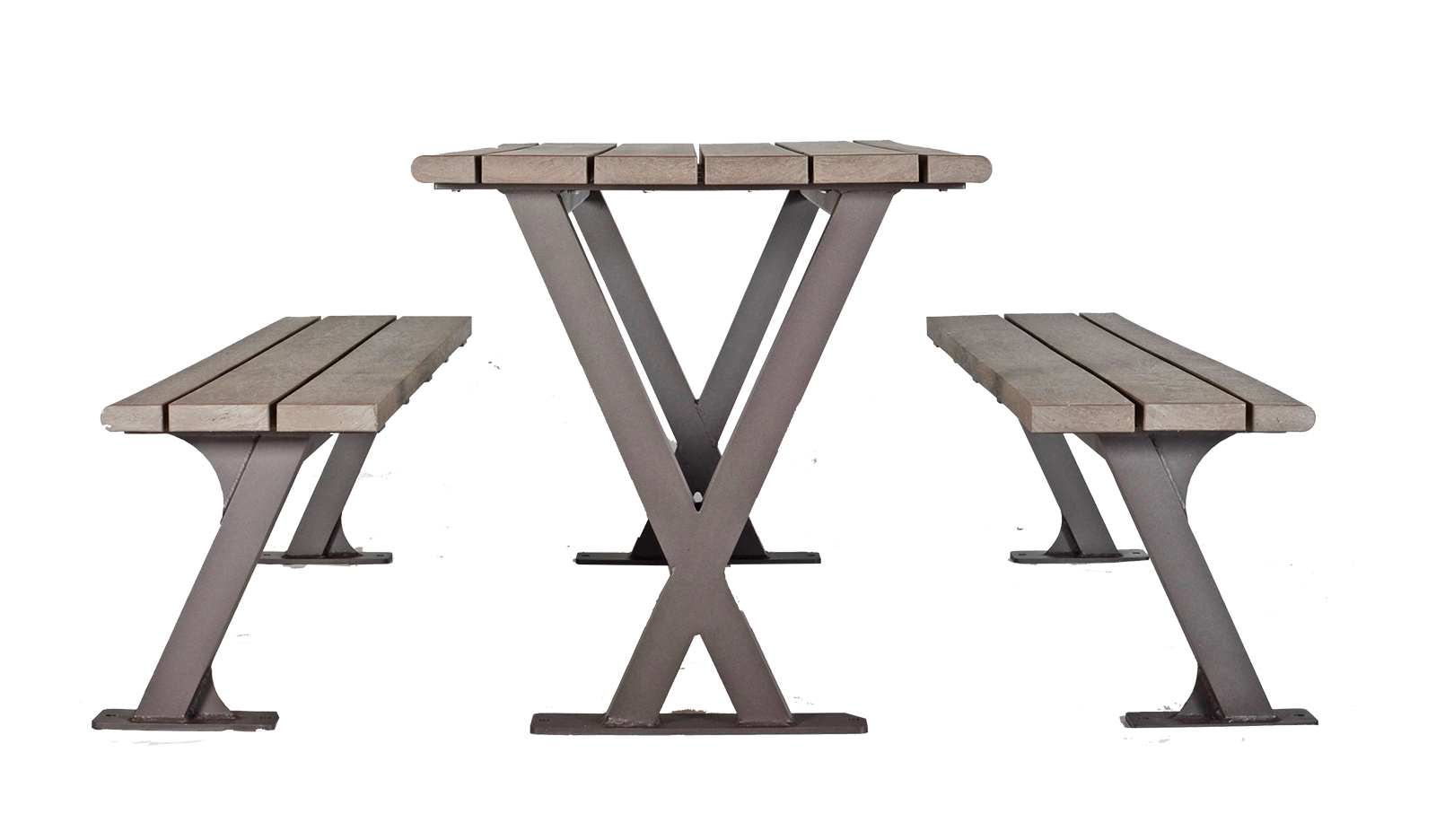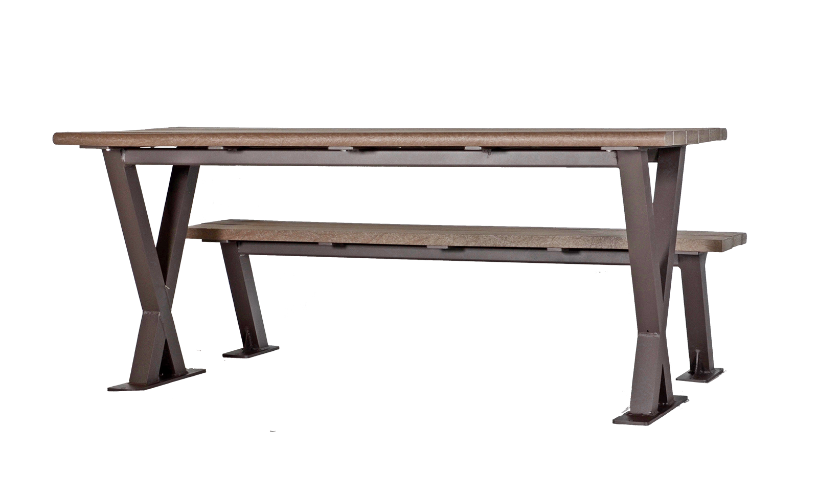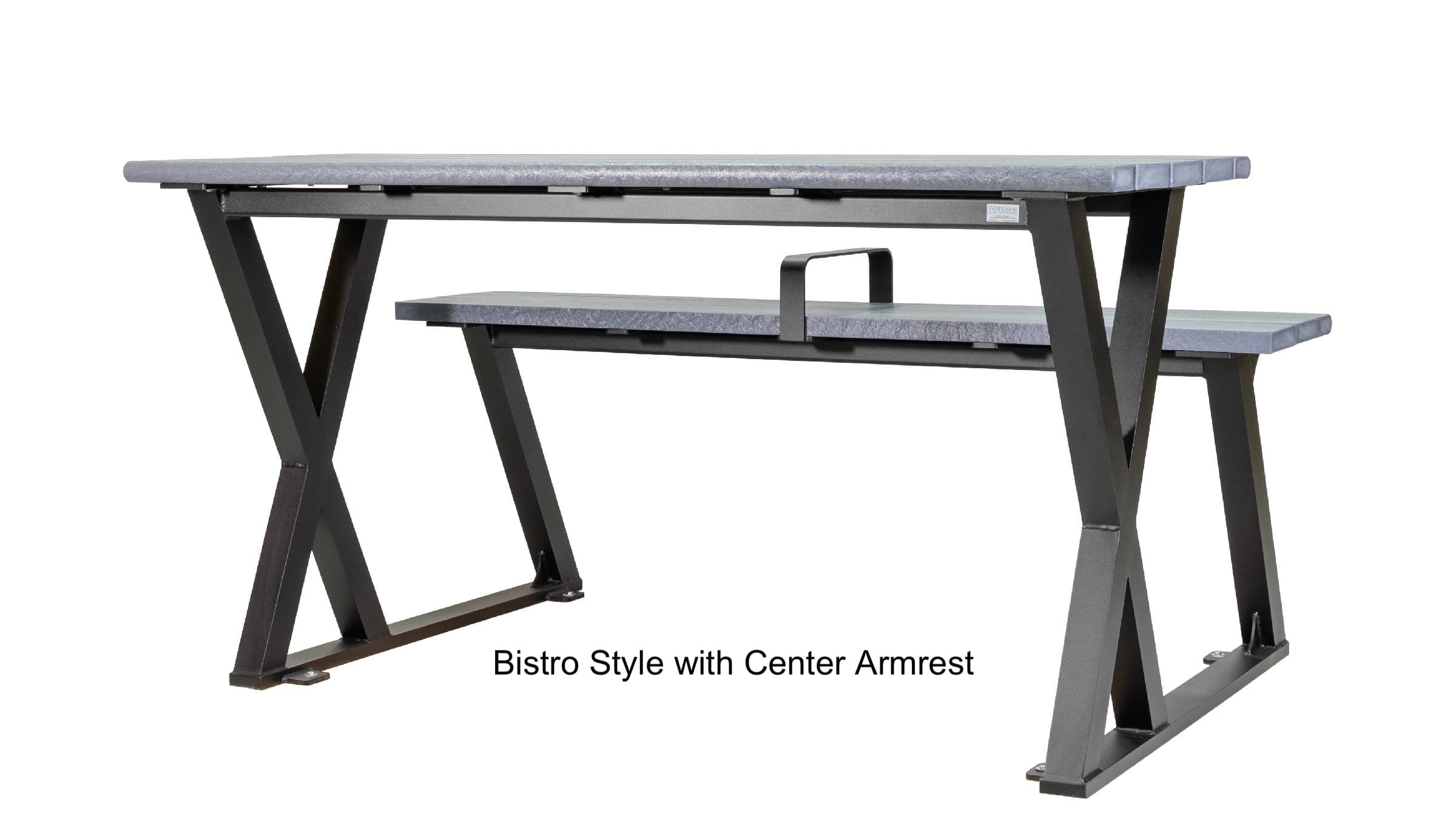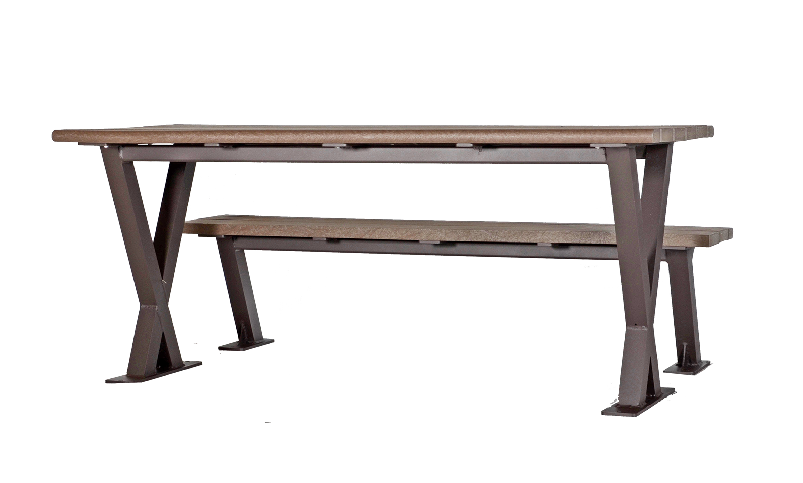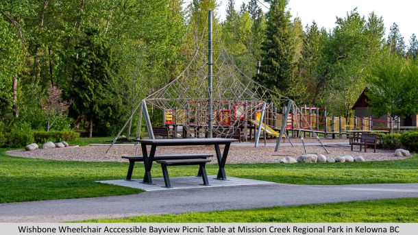 Aesthetically pleasing and extremely functional, the Bayview Picnic Table was designed to match our popular Bayview Park Bench. The goal with this model was to address the shortcomings of traditional picnic tables such as accessibility, comfort, and seat depth. To increase accessibility, the feet and structural elements are angled away from the user meaning less bumped knees and awkward entries. Bull-nosed boards on the tabletop and seat soften the edges and allow a person to comfortably lean against the table edge as a backrest. The Bayview Picnic Table also has a significantly wider seat depth to accommodate a variety of patrons.   It can be Wheelchair accessible with either a table top extension, or by custom building it as a one-sided picnic table with no bench on one side.  This design has all the low- maintenance features inherent to our products: powder coated aluminum frame, 100% recycled plastic slats, and stainless-steel fasteners.