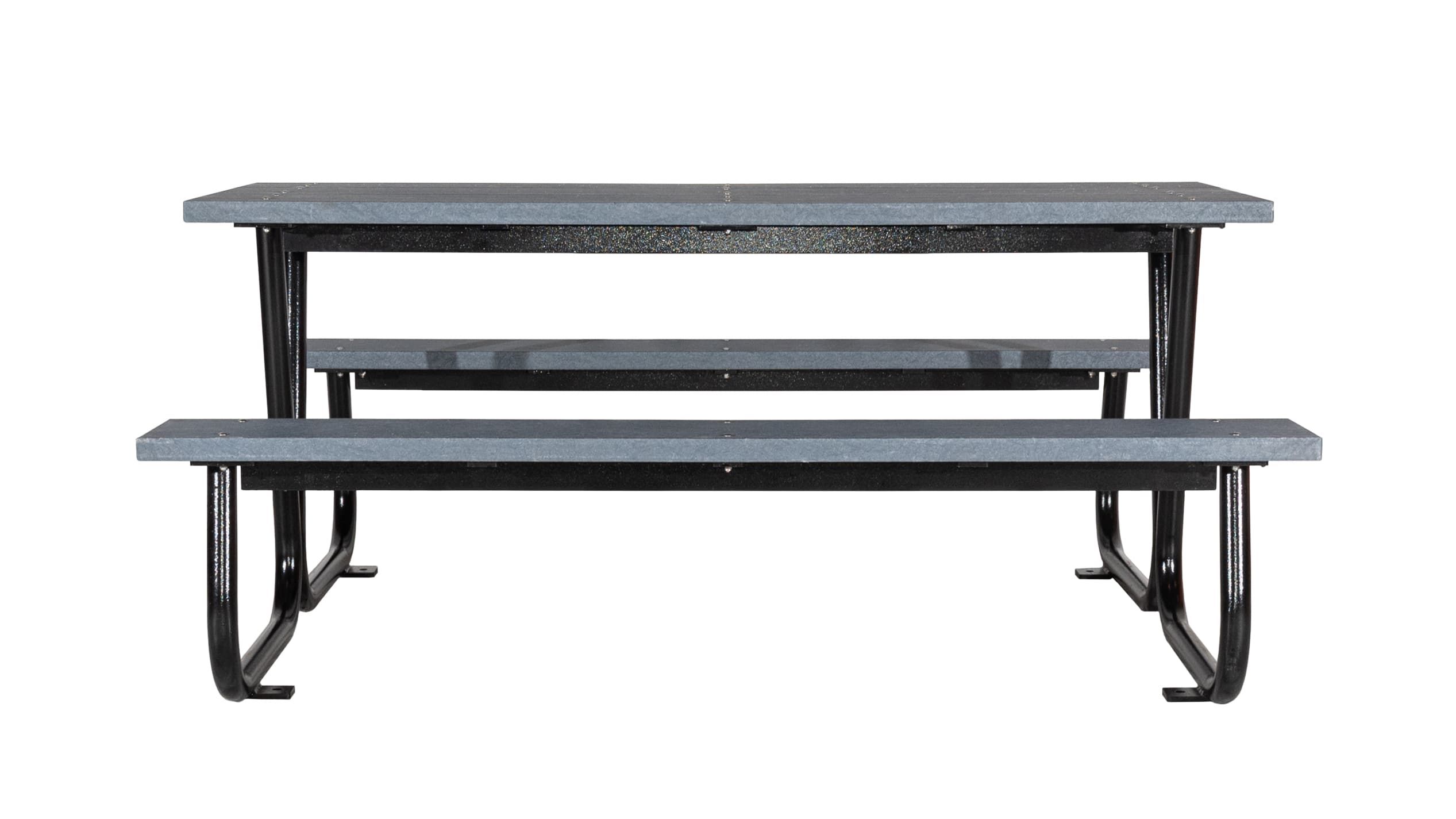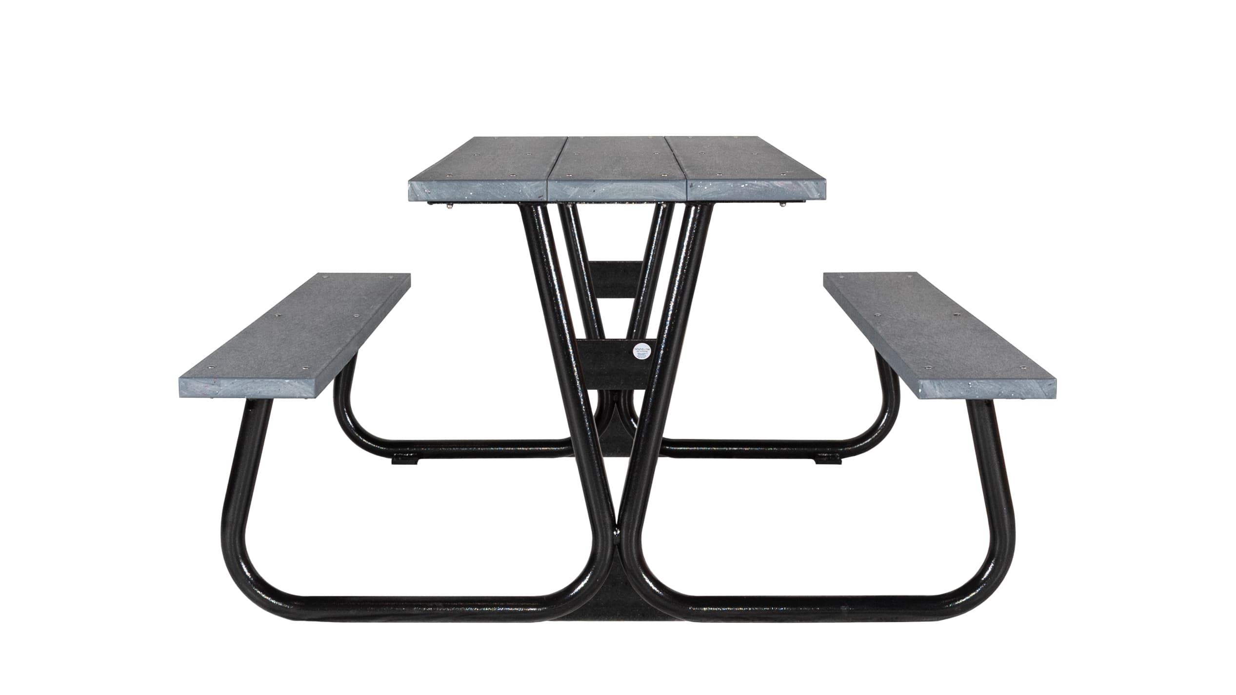 This tubular style picnic table is probably the most recognized design in municipal applications. And for good reason; they are very strong, functional, and represent a good value in these settings. The only challenge to the design is that most are made for wood and retrofitting for the lower maintenance recycled plastic lumber and aluminum frames has really not been done effectively…. until now!