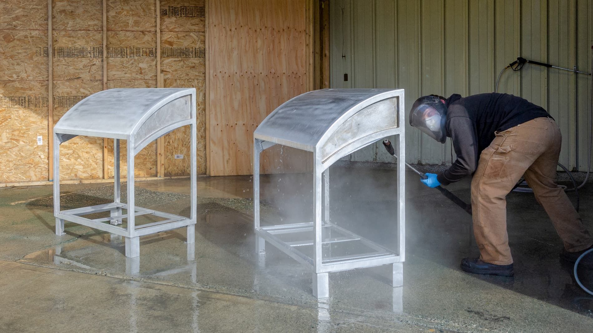 Consists of a heated alkaline based degreaser / cleaner to remove mixed metals, oils and contaminates prior to powder coating.